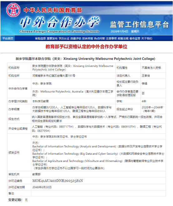该机构紧密对接国家和我省战略性新兴产业发展需求,聚焦高端应用型人才培养,引进澳大利亚优质教育资源,开设人工智能、数据科学与大数据技术、酿酒工程3个专业,实施国内普通本科教育和澳大利亚学士学位教育。学生将同时注册中澳两国高校学籍,达到毕业要求者获得中澳双方本科文凭和学士学位,且获得澳方学位不以出国学习一段时间为必要条件,实现不出国的留学。学院年度招生计划初步核定为300人,全部纳入国家普通高等教育招生计划,2026年将正式启动首届招生工作。