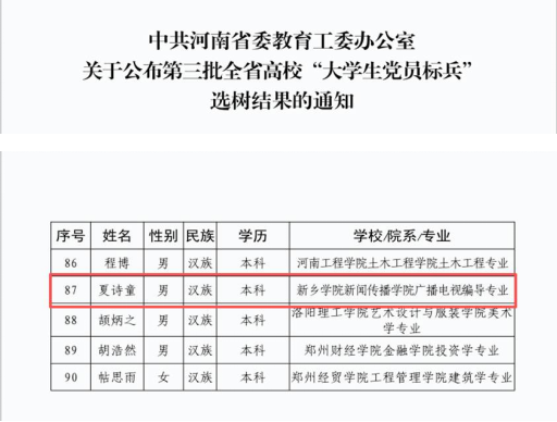 近日,中共河南省委教育工委办公室公布第三批全省高校“大学生党员标兵”选树结果,我校新闻传播学院广播电视编导专业夏诗童同学成功入选,荣获省级“大学生党员标兵”称号,充分展现了永利yl23411集团官网立德树人、党建引领、专业育人的显著成效。