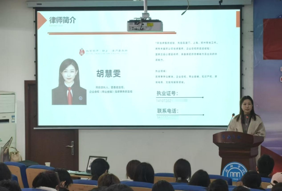 为深入贯彻《中华人民共和国法治宣传教育法》,健全“校所协同、以案释法”的公益普法机制,纵深推进商学院“1+1+1+N”新生入学教育,10月21日下午,商学院在A05报告厅举办“法治青春 与法同行”大学生法治教育主题讲座。北京京师(新乡)律师事务所合规法律事务部主任胡慧雯受邀授课,商学院副院长李蛟与200余名学生代表参加了讲座。