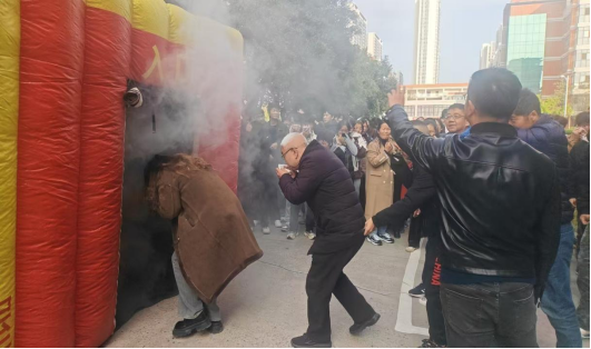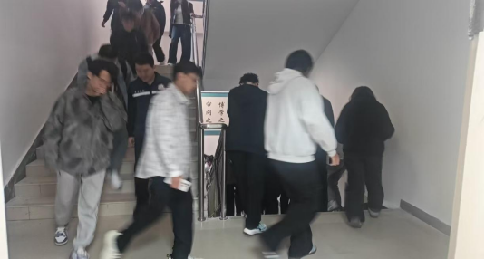 伴随着火警铃声和滚滚浓烟,各楼层疏导员迅速到位,按照A14号楼内的疏散路线,引导师生们用湿毛巾捂住口鼻,弯腰低姿,快速有序地向室外安全区域疏散。在疏散过程中,师生们严格遵守演练纪律,听从指挥,不推挤、不慌乱,整个疏散过程紧张而有序。短短2分30秒,参与演练的全体人员均安全从六楼撤离至指定集合点。随后,各班级负责人迅速清点人数,向演练总指挥汇报疏散情况。随后全体师生在A14号教学楼前疏散演练帐篷中再次体验了在浓烟和摸黑情况下,掩鼻、低姿态、靠墙逃生的行走状态。