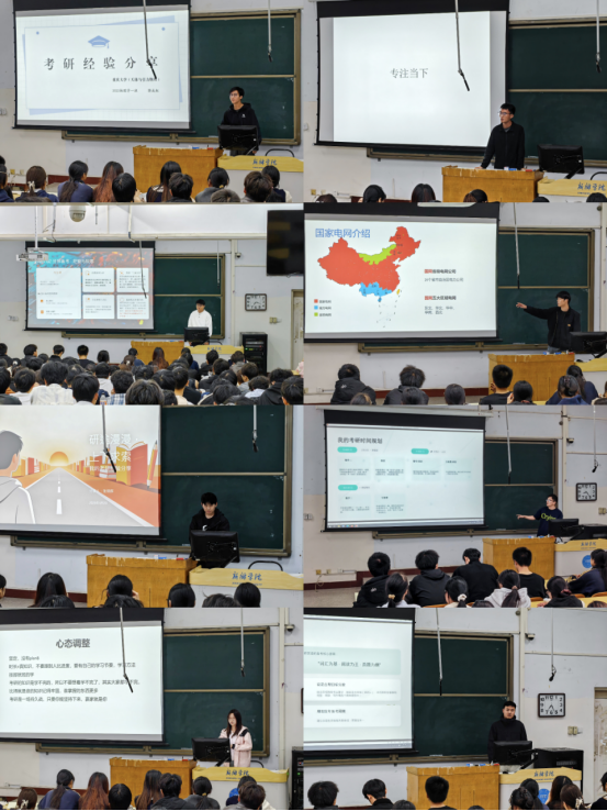 分享会上,八位优秀学子结合自身经历,倾囊相授备考经验与心路历程。考研上岸河南理工大学的22级电气专业付岩俊同学,从专业课复习节奏、真题利用技巧到心态调整策略,系统梳理了“三阶段备考法”,强调“坚持比爆发更重要”;22级电气专业周豪同学则以上海海事大学为目标,分享了如何精准定位院校、搜集信息以及平衡课程学习与考研复习的时间管理心得;来自24级光电专升本专业的张锦辉和22级光电专业的韩健龙同学双双被太原理工大学录取,他们不约而同地提到“研友互助”的重要性,鼓励学弟学妹组建学习小组,在讨论中突破难点、在督促中共同成长;22级物理专业李晶晶和22级物理学专业樊成鈺同学分别被郑州大学和重庆大学录取,她们从跨校备考的角度,讲述了如何克服信息不对称、主动联系导师以及打磨专业课答题逻辑的实战经验;22级电科专业冯东东同学同样上岸郑州大学,他重点分享了英语和政治的提分技巧,强调“短板决定高度,不漏重于重复”。此外,22级电气专业郭雨斐同学作为成功入职国家电网的代表,从企业招录视角出发,详细解读了网申准备、笔试科目侧重、面试礼仪与应答策略,为有志于投身电力行业的同学提供了清晰的职业规划路径。现场掌声不断,同学们认真记录、踊跃提问,学长学姐们耐心解答,互动氛围热烈而真挚。