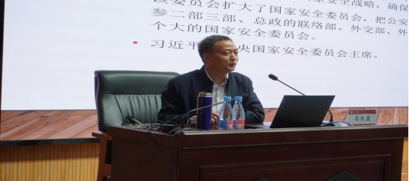 本次报告会特邀公安部优秀人才一等奖获得者、中国人民警察大学硕士生导师马长泉教授主讲。报告会围绕“国家安全与国家安全观”“新时代我国边境管理发展成就”两大主题展开。马长泉教授首先系统阐释了国家安全的深刻内涵,强调总体国家安全观是习近平新时代中国特色社会主义思想的重要组成部分,涵盖政治、经济、军事、文化、社会等多领域安全。他通过历史与现实案例,深入剖析维护国家安全的紧迫性与必要性,并呼吁师生从增强保密意识、防范网络风险、维护社会稳定等具体行动中践行责任。“国家安全是民族复兴的根基,每一位公民都应是国家安全的捍卫者。”马长泉教授指出,青年学生尤其需树立底线思维,将安全理念融入学习生活,共同构筑国家安全的人民防线。在第二部分的讲解中,马长泉教授以详实的数据和生动的实践成果,全景式展现了新时代我国边境管理的跨越式发展成就。